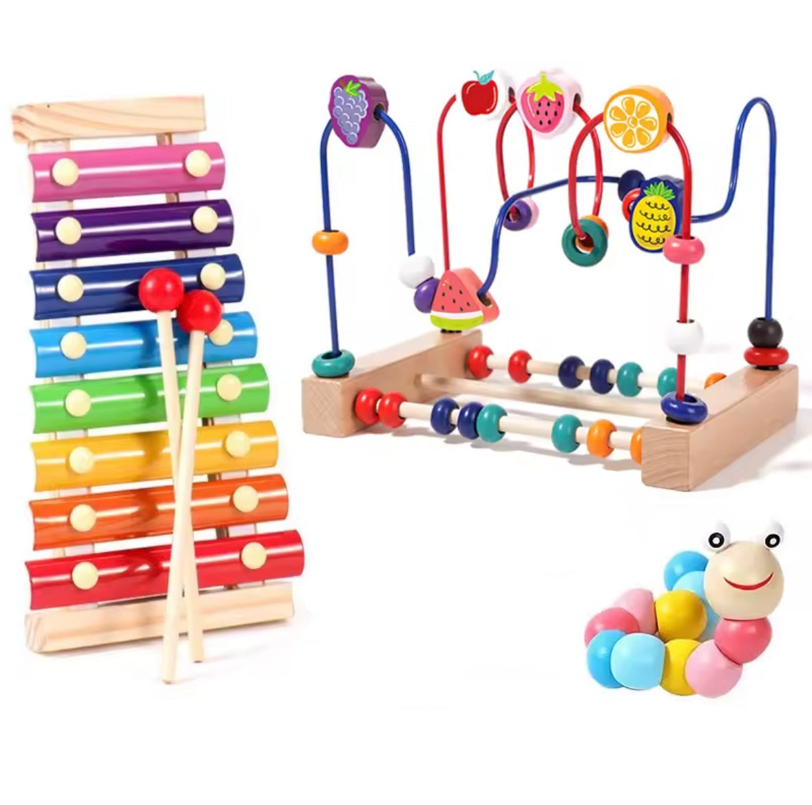 Colorful wooden toys including a xylophone, bead maze, and twist worm on a white background.